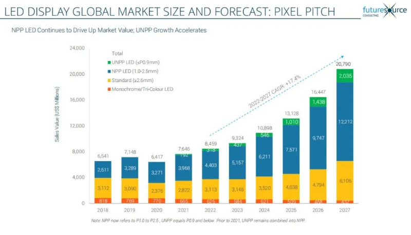 2022年,全球LED显示行业展现出持续增长的强劲势头。Futuresource报告显示,2022年全球LED显示市场达到85亿美元,与2021年相比增长了10.6%。Futuresource预计2023年全球LED市场的收入将增长10.2%,达到93亿美元。五年预测显示,到2027年,复合年增长率(CAGR)将达到17.4%,市场规模将增至208亿美元。体育333作为国家制造业单项冠军,对显示行业未来发展充满信心。